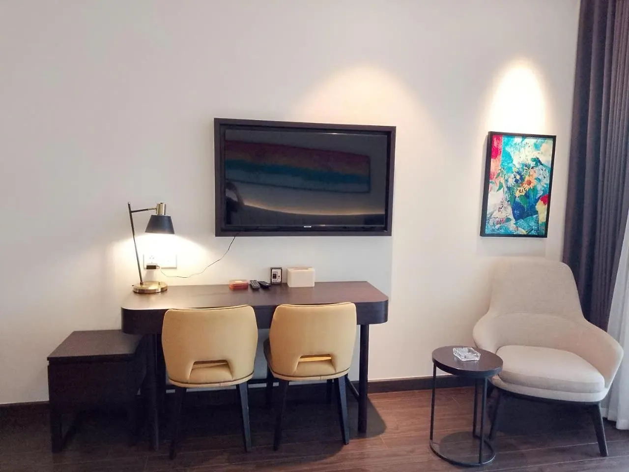 Melody Condotel In Ha Long Bay apartment features a balcony, equipped with modern amenities such as a cable flat-screen TV to enhance your stay. This apartment offers guests the convenient feature of hairdryers and slippers in the bathroom. A shower can also be found.